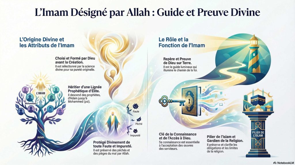 L’Imam est l’élu agréé, le guide choisi, celui qui se lève en qui on espère. Allah l’a choisi pour cela et l’a formé sous Son regard dans le monde des particules quand Il les a créées, et parmi les créatures quand Il les a façonnées. Il était une ombre avant la création de toute âme, à la droite de Son Trône, aimé par la Sagesse dans la connaissance de l’invisible auprès de Lui. Il l’a choisi par Sa science et l’a sélectionné pour sa pureté. Un reste d’Adam (que la paix soit sur lui), un choix parmi la descendance de Noé, un élu de la famille d’Abraham, une lignée d’Ismaël, et l’élite de la famille de Mohammed (que la paix et les bénédictions soient sur lui et sa famille). Il n’a cessé d’être observé par l’œil d’Allah, qui le préserve et le protège de Son voile. Les pièges d’Iblis et de ses armées sont repoussés de lui, les afflictions des ténèbres et les souffles de tout pervers sont écartés de lui. Les impuretés du mal sont détournées de lui, il est exempt d’infirmités, protégé des calamités, préservé des fautes, gardé de toutes les turpitudes. Il est reconnu pour sa clémence et sa piété dans sa jeunesse, attribué à la chasteté, la connaissance et la vertu à sa maturité. L’affaire de son père lui est confiée, gardant le silence sur la parole durant sa vie.