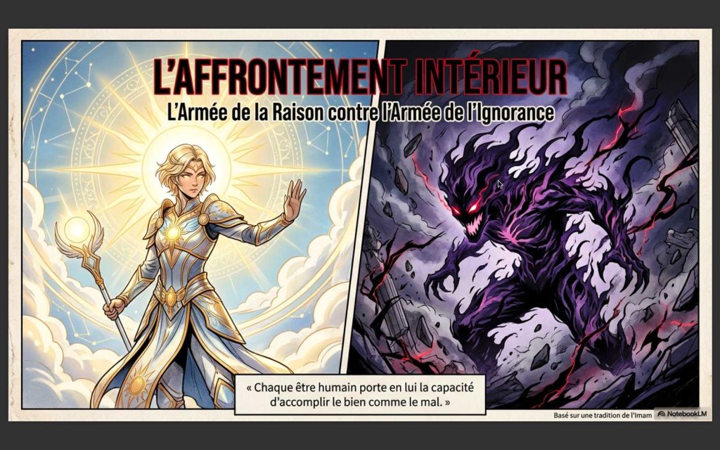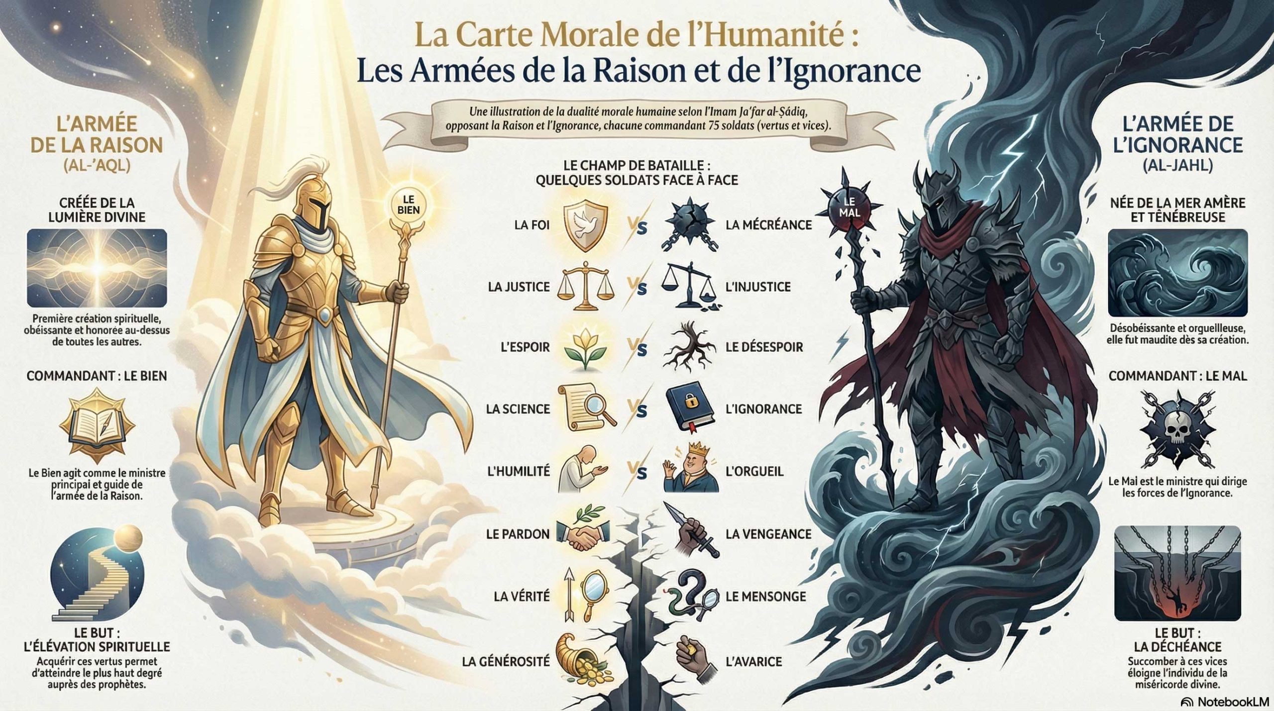 Parmi ce qu’Il donna à la Raison comme soixante-quinze soldats : le Bien, qui est le ministre de la Raison, et Il fit son contraire le Mal, qui est le ministre de l’Ignorance ; la Foi et son contraire la Mécréance ; la Confirmation et son contraire le Déni ; l’Espoir et son contraire le Désespoir ; la Justice et son contraire l’Injustice ; la Satisfaction et son contraire le Mécontentement ; la Gratitude et son contraire l’Ingratitude ; l’Aspiration et son contraire le Désespoir ; la Confiance et son contraire la Cupidité ; la Compassion et son contraire la Dureté ; la Miséricorde et son contraire la Colère ; la Science et son contraire l’Ignorance ; la Compréhension et son contraire la Sottise ; la Chasteté et son contraire la Débauche ; l’Ascétisme et son contraire le Désir ; la Douceur et son contraire la Brutalité ; la Crainte et son contraire la Témérité ; l’Humilité et son contraire l’Orgueil ; la Sérénité et son contraire la Précipitation ; la Clémence et son contraire la Frivolité ; le Silence et son contraire le Bavardage ; la Soumission et son contraire l’Arrogance ; l’Acceptation et son contraire le Doute ; la Patience et son contraire l’Impatience ; le Pardon et son contraire la Vengeance ; la Richesse et son contraire la Pauvreté ; le Souvenir et son contraire l’Oubli ; la Préservation et son contraire l’Amnésie ; la Bienveillance et son contraire la Rupture ; le Contentement et son contraire l’Avidité ; l’Entraide et son contraire le Refus ; l’Affection et son contraire l’Hostilité ; la Fidélité et son contraire la Trahison ; l’Obéissance et son contraire la Désobéissance ; la Soumission et son contraire la Hauteur ; la Paix et son contraire l’Épreuve ; l’Amour et son contraire la Haine ; la Vérité et son contraire le Mensonge ; le Droit et son contraire le Faux ; l’Honnêteté et son contraire la Trahison ; la Sincérité et son contraire la Duplicité ; la Noblesse et son contraire la Stupidité ; la Compréhension et son contraire l’Idiotie ; la Connaissance et son contraire la Négation ; la Diplomatie et son contraire la Confrontation ; la Préservation du secret et son contraire la Ruse ; la Discrétion et son contraire la Divulgation ; la Prière et son contraire la Négligence ; le Jeûne et son contraire la Rupture du jeûne ; le Jihad et son contraire le Recul ; le Pèlerinage et son contraire la Violation du pacte ; la Préservation de la parole et son contraire la Médisance ; la Piété filiale et son contraire la Désobéissance ; la Sincérité et son contraire l’Ostentation ; le Bien et son contraire le Blâmable ; la Pudeur et son contraire l’Impudeur ; la Discrétion et son contraire la Divulgation ; l’Équité et son contraire le Fanatisme ; la Préparation et son contraire l’Oppression ; la Propreté et son contraire la Saleté ; la Pudeur et son contraire l’Effronterie ; la Modération et son contraire l’Excès ; le Repos et son contraire la Fatigue ; la Facilité et son contraire la Difficulté ; la Bénédiction et son contraire l’Effacement ; la Santé et son contraire l’Affliction ; la Mesure et son contraire l’Ostentation ; la Sagesse et son contraire la Passion ; la Dignité et son contraire la Légèreté ; le Bonheur et son contraire le Malheur ; le Repentir et son contraire l’Obstination ; la Demande de pardon et son contraire la Présomption ; la Vigilance et son contraire la Négligence ; l’Invocation et son contraire le Dédain ; l’Activité et son contraire la Paresse ; la Joie et son contraire la Tristesse ; la Concorde et son contraire la Division ; la Générosité et son contraire l’Avarice.
