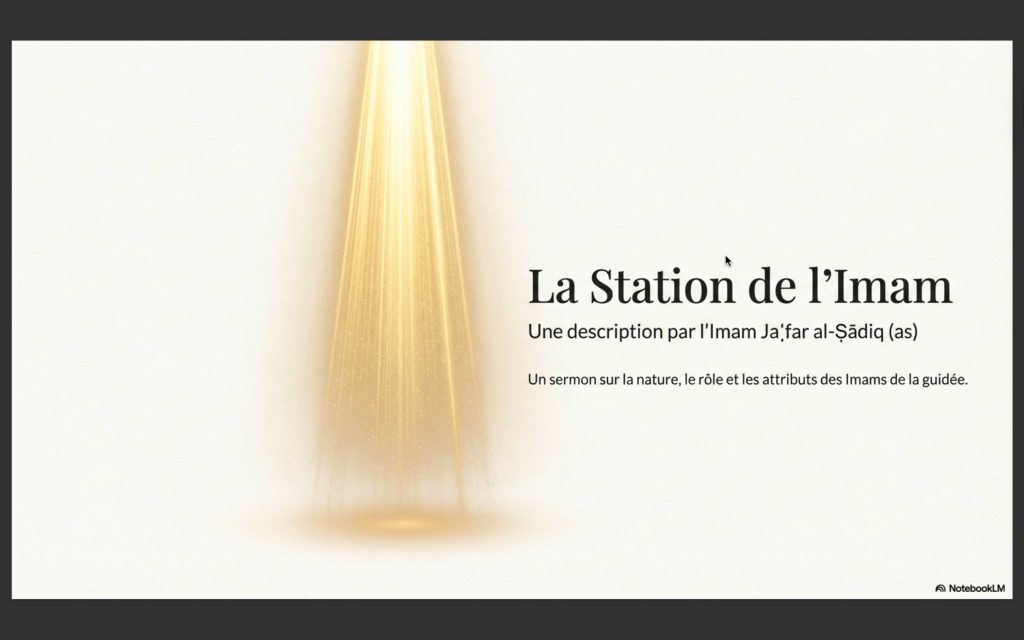 L’Imam est l’élu agréé, le guide choisi, celui qui se lève en qui on espère. Allah l’a choisi pour cela et l’a formé sous Son regard dans le monde des particules quand Il les a créées, et parmi les créatures quand Il les a façonnées. Il était une ombre avant la création de toute âme, à la droite de Son Trône, aimé par la Sagesse dans la connaissance de l’invisible auprès de Lui. Il l’a choisi par Sa science et l’a sélectionné pour sa pureté. Un reste d’Adam (que la paix soit sur lui), un choix parmi la descendance de Noé, un élu de la famille d’Abraham, une lignée d’Ismaël, et l’élite de la famille de Mohammed (que la paix et les bénédictions soient sur lui et sa famille). Il n’a cessé d’être observé par l’œil d’Allah, qui le préserve et le protège de Son voile. Les pièges d’Iblis et de ses armées sont repoussés de lui, les afflictions des ténèbres et les souffles de tout pervers sont écartés de lui. Les impuretés du mal sont détournées de lui, il est exempt d’infirmités, protégé des calamités, préservé des fautes, gardé de toutes les turpitudes. Il est reconnu pour sa clémence et sa piété dans sa jeunesse, attribué à la chasteté, la connaissance et la vertu à sa maturité. L’affaire de son père lui est confiée, gardant le silence sur la parole durant sa vie.